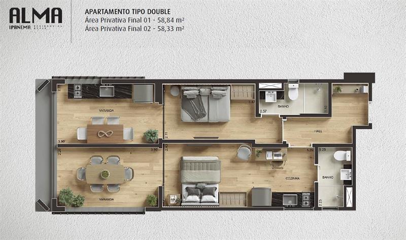 Os apartamentos tipo possuem 58 m², com plantas otimizadas para garantir conforto e praticidade. Há opções com até 2 quartos e possibilidade de personalização, incluindo adaptações de layout e materiais de acabamento. Todas as unidades contam com boa iluminação natural, ventilação eficiente e infraestrutura de alto padrão.