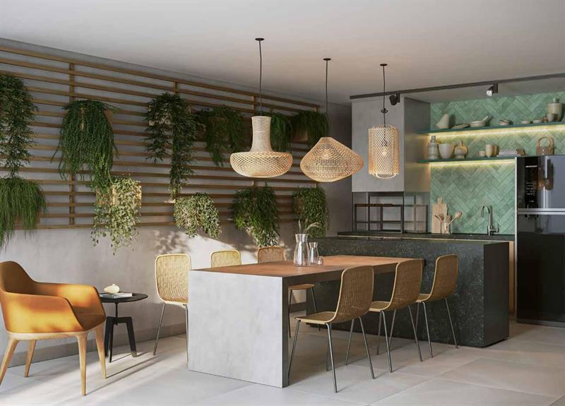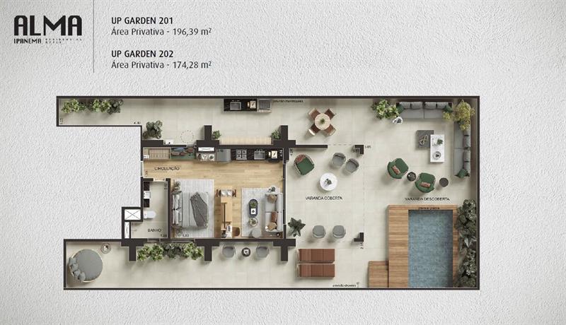 As unidades garden variam entre 174 m² e 196 m², oferecendo amplitude e exclusividade. Os imóveis possuem 1 quarto e contam com áreas externas privativas compostas por terraço descoberto, varanda coberta, piscina e espaço gourmet com churrasqueira, além de ambientes internos integrados e bem planejados.