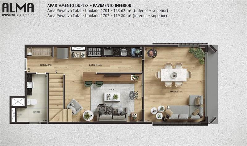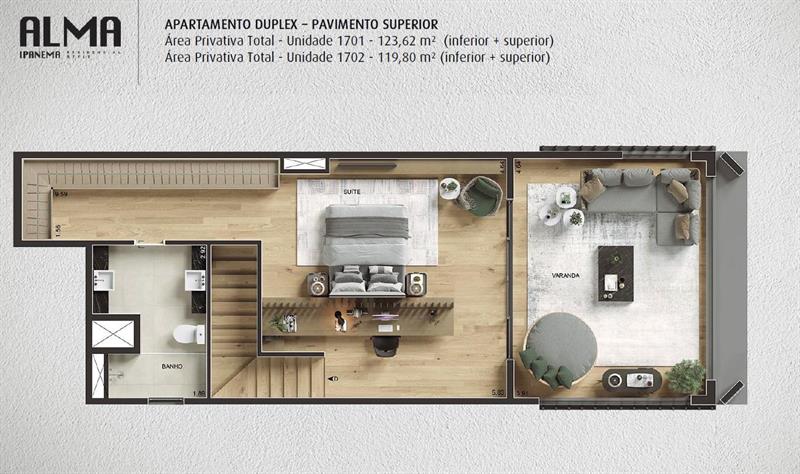 As coberturas duplex têm 119 m² e oferecem um layout moderno, com ampla suíte no pavimento superior e vistas privilegiadas para a região. Os imóveis contam com ambientes bem distribuídos, privacidade entre os cômodos e possibilidade de adaptações para atender ao estilo de vida dos moradores.