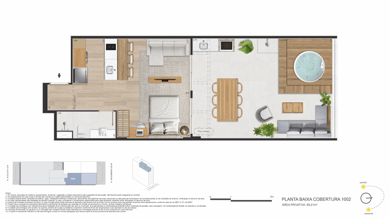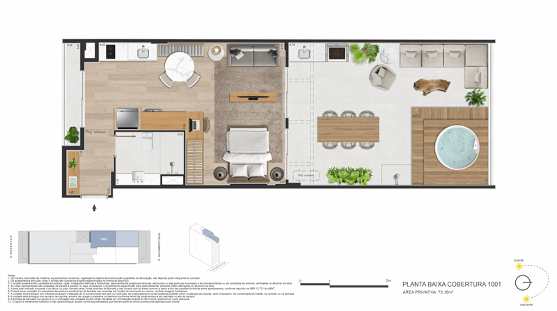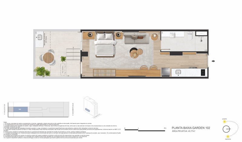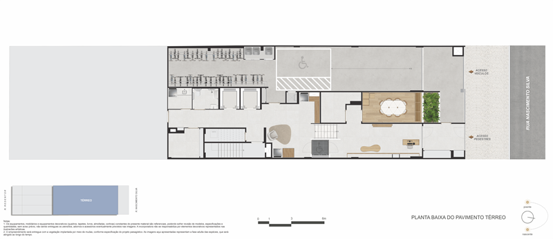No térreo, a praticidade é garantida por coworking, mini mercado, maleiro, espaço delivery, bicicletário e portaria com hall social. O conceito de smart living é reforçado com infraestrutura de automação, fechaduras biométricas, acessibilidade total, áreas comuns com Wi-Fi e placas solares para maior eficiência energética.