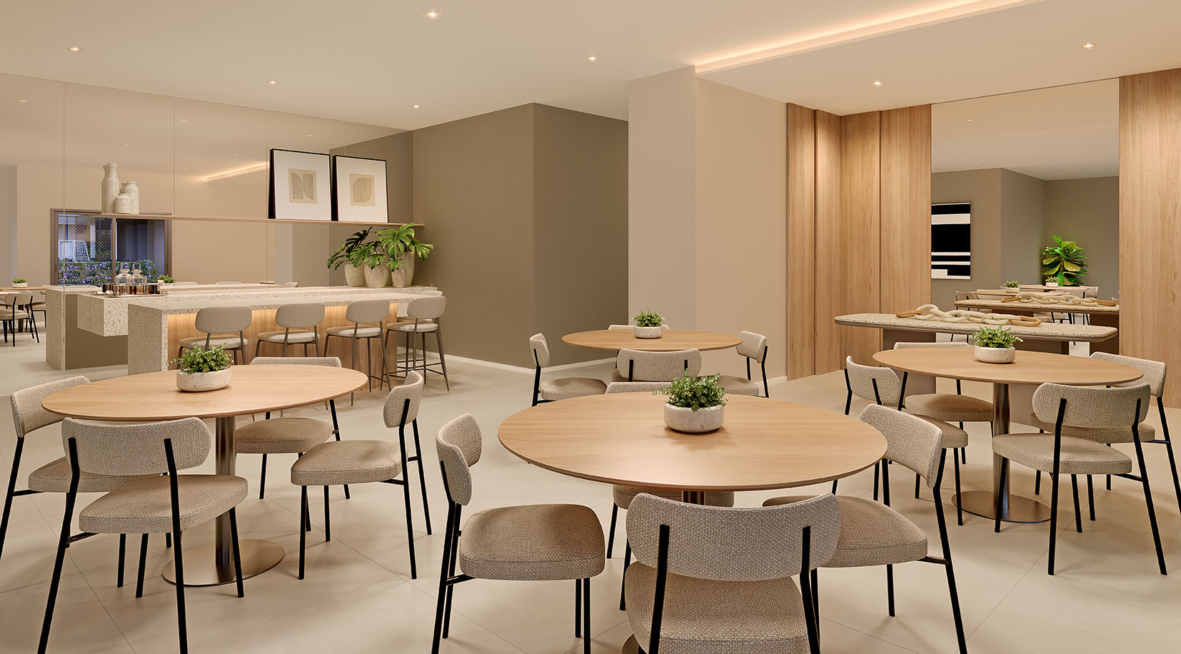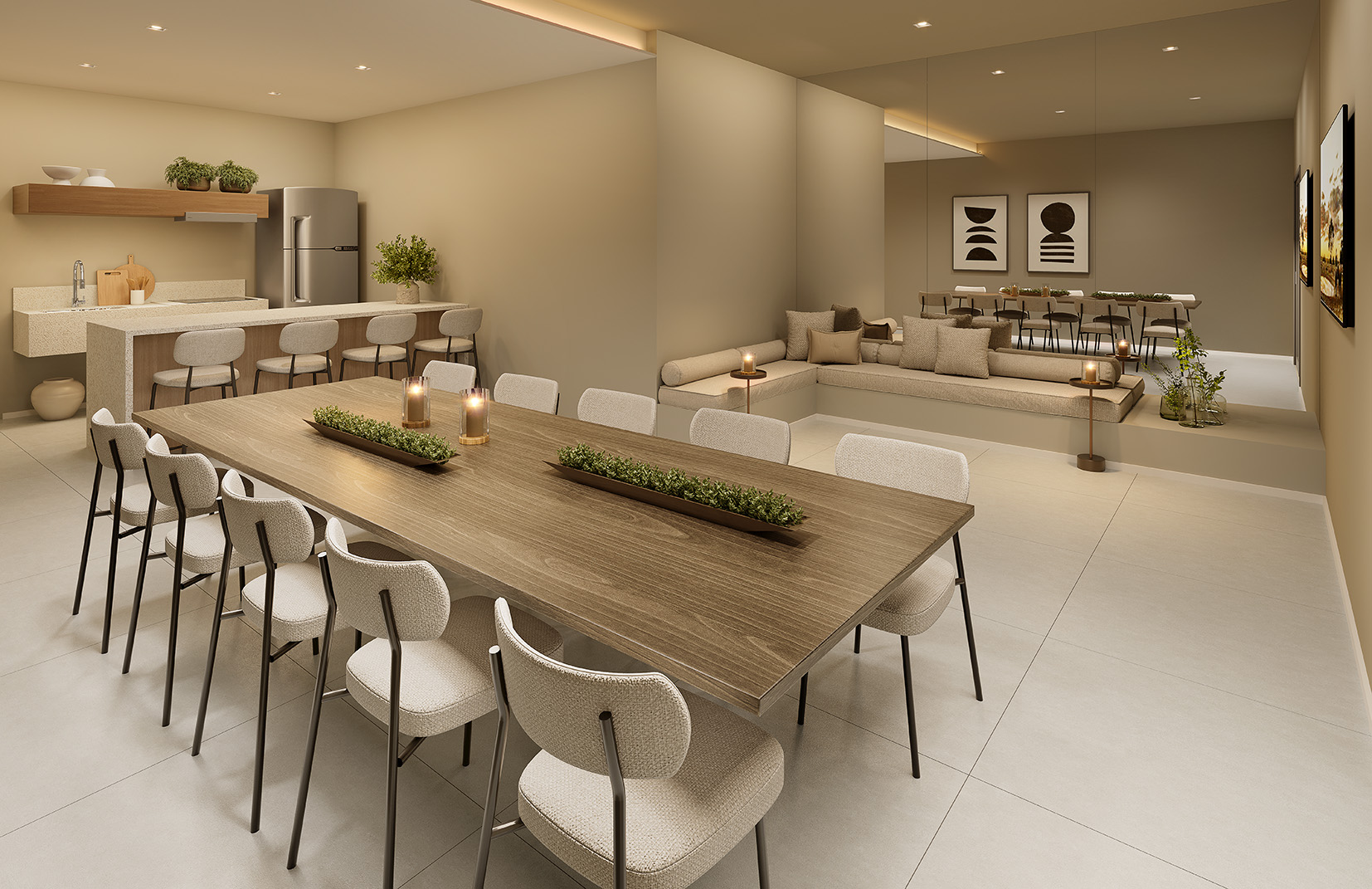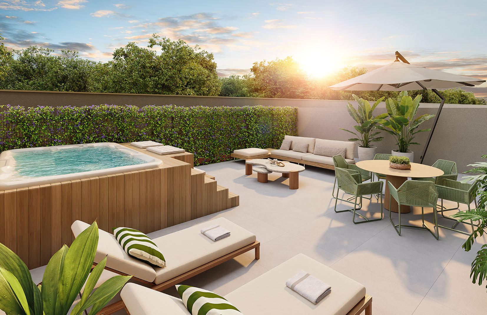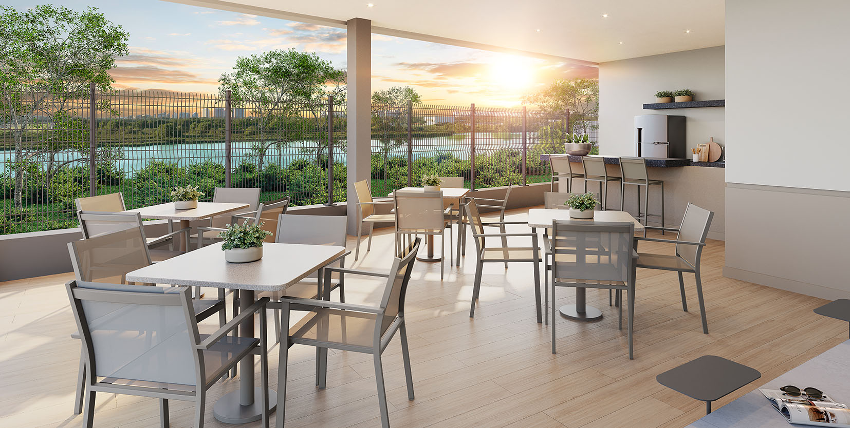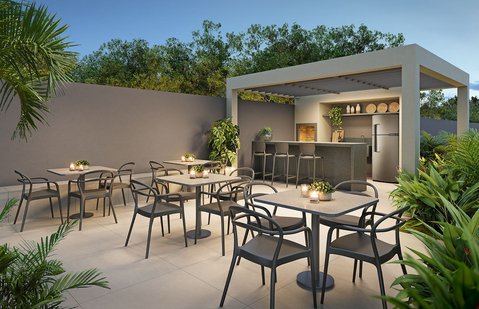 As unidades garden apresentam metragens entre 69 m² e 149 m² e incluem áreas externas privativas. Essa tipologia amplia as possibilidades de uso dos espaços, mantendo o conceito de praticidade do apartamento com a vantagem de um ambiente ao ar livre.