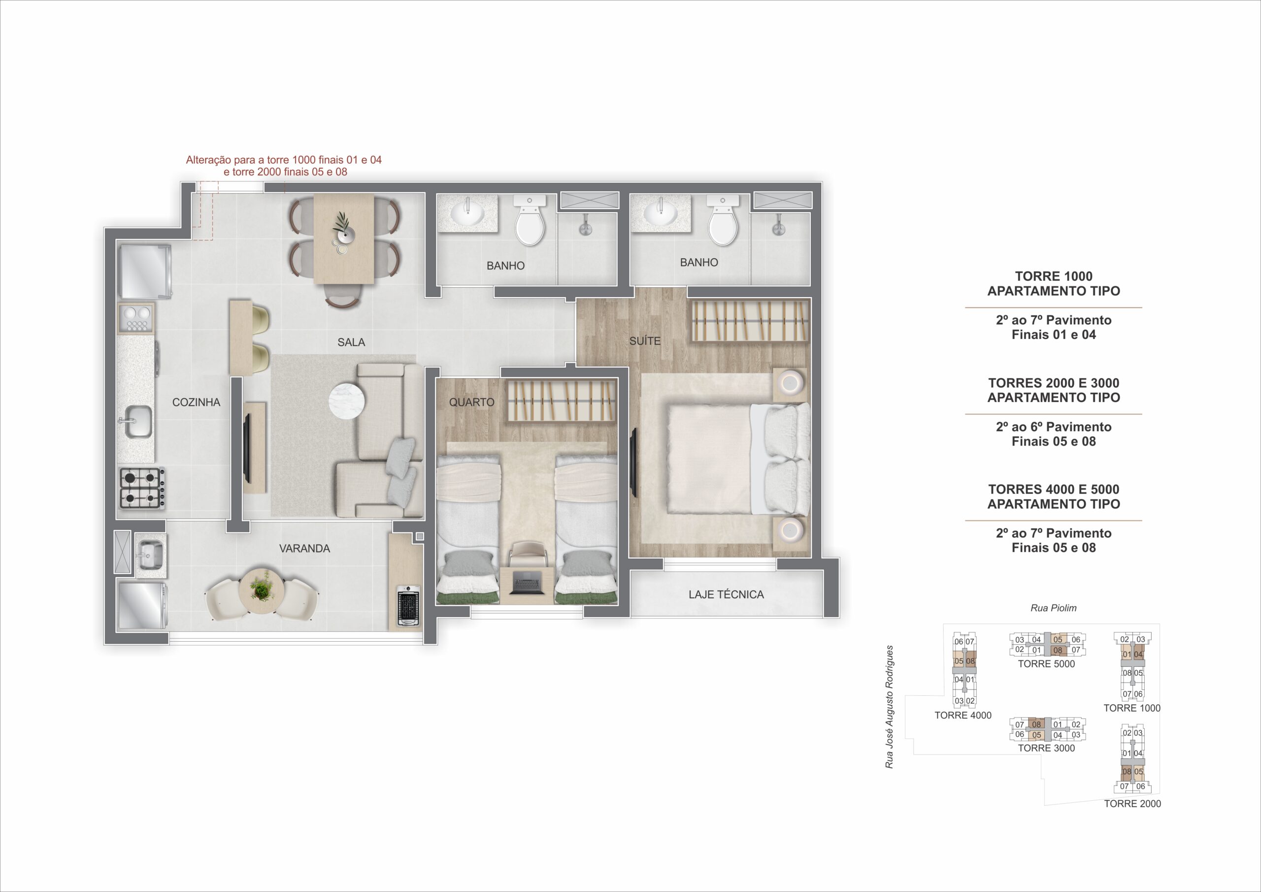 Os apartamentos tipo possuem metragens entre 55 m² e 70 m², com plantas de 2 ou 3 quartos com suíte. Os ambientes são distribuídos de forma eficiente, com varandas que contribuem para ventilação e iluminação natural, além de acabamentos modernos.