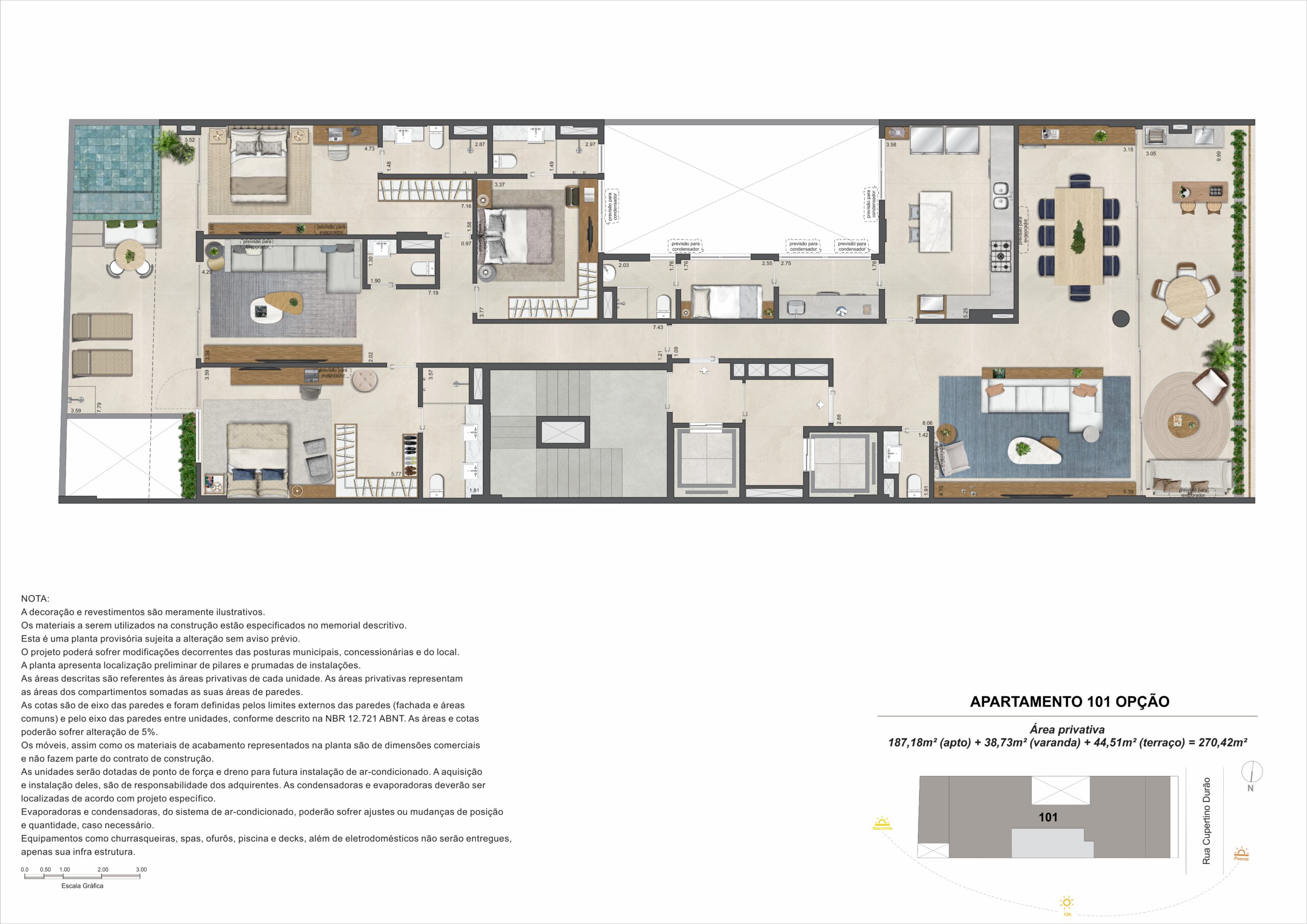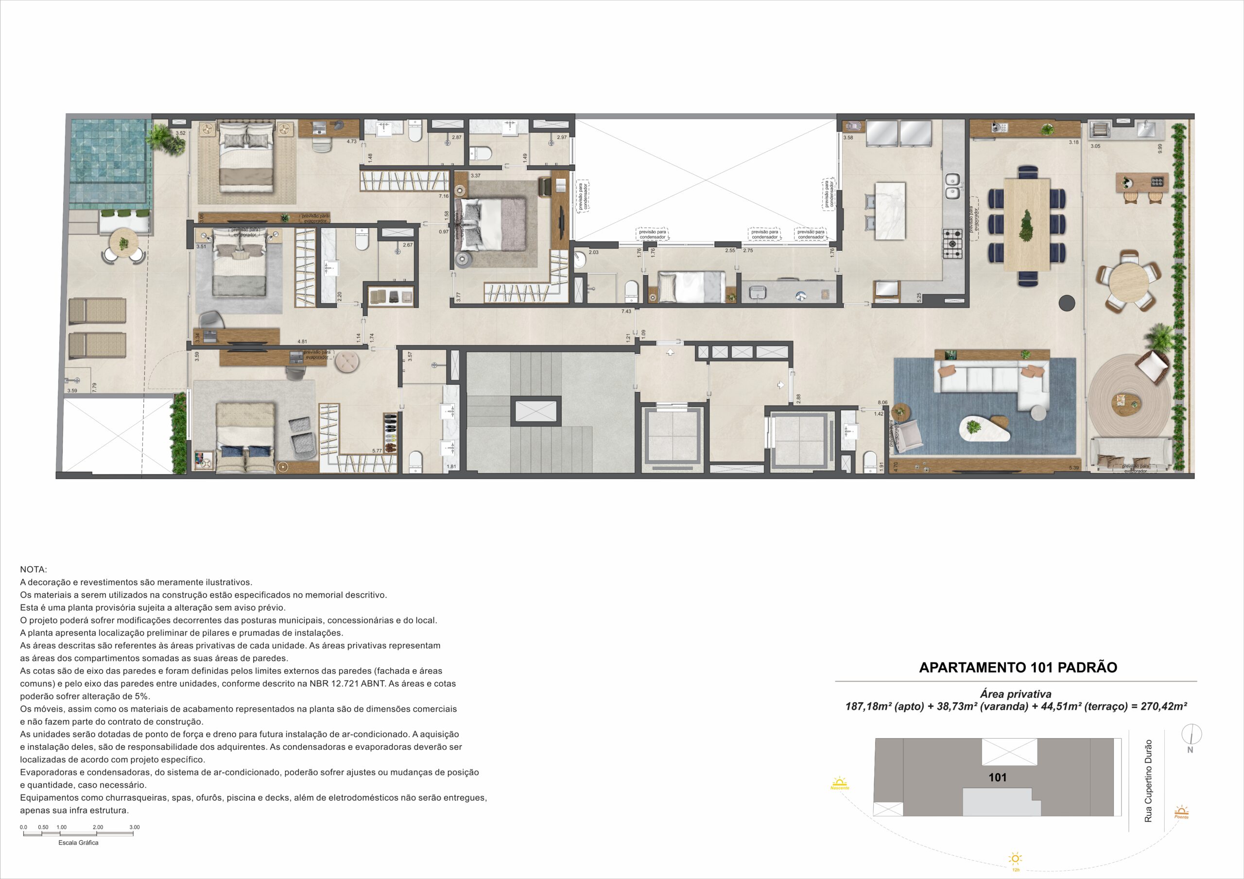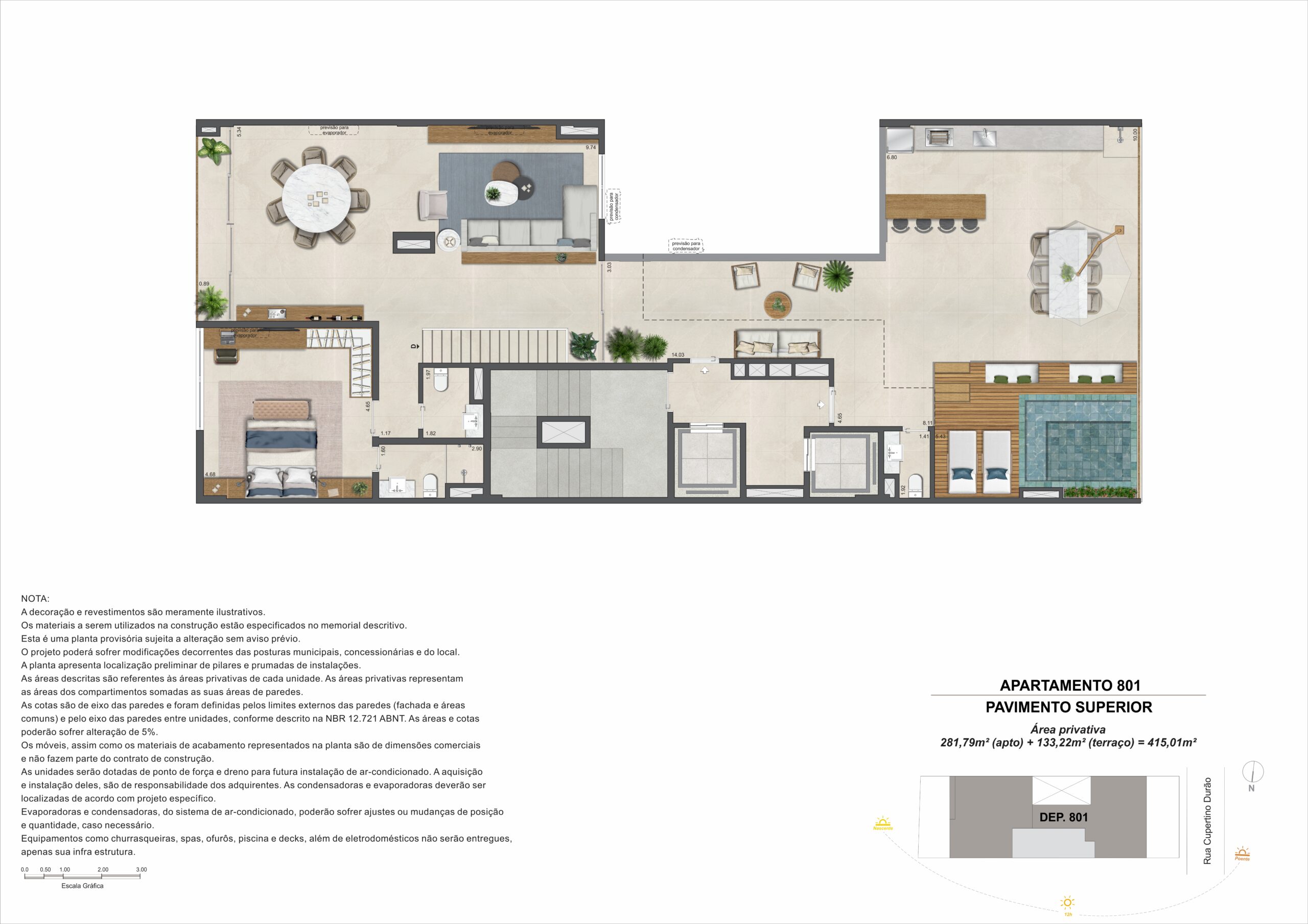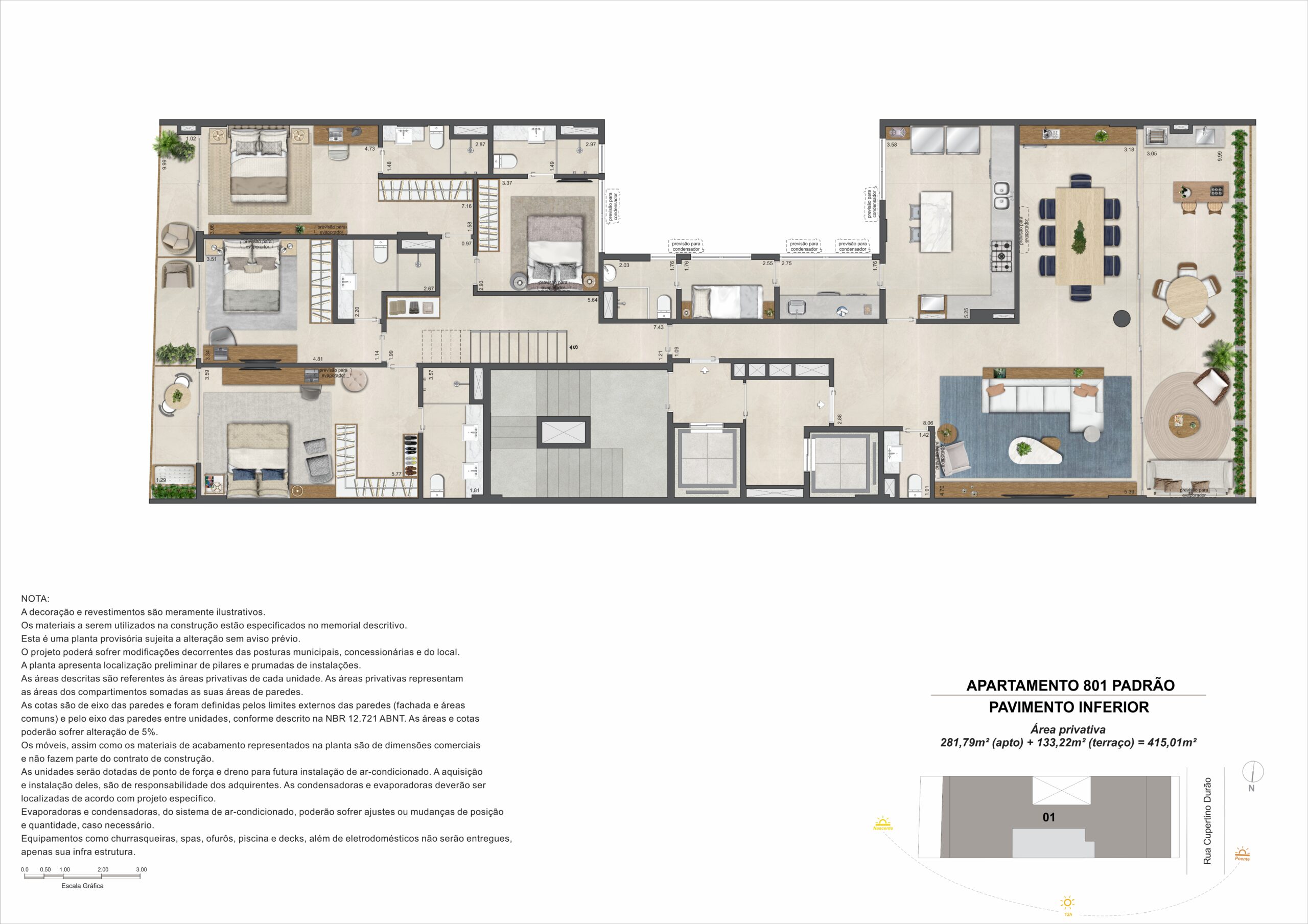 A cobertura duplex possui 415,01 m² e cinco suítes, com distribuição que valoriza áreas internas e externas. O pavimento superior inclui terraço com espaço gourmet e previsão para piscina privativa, ampliando as possibilidades de uso e convivência.