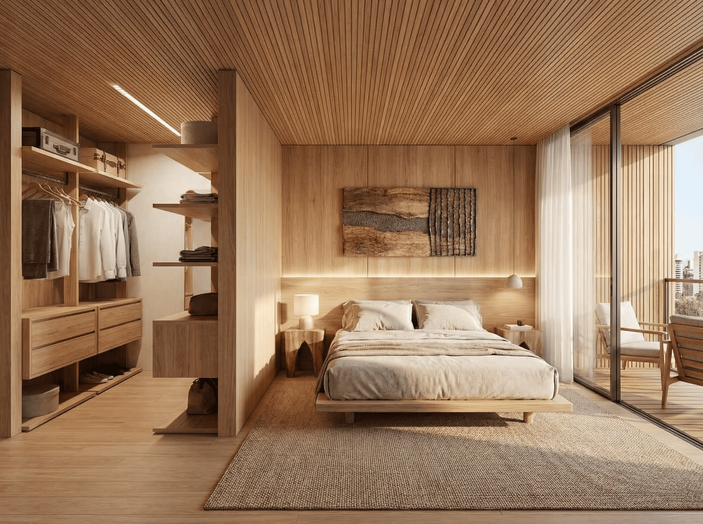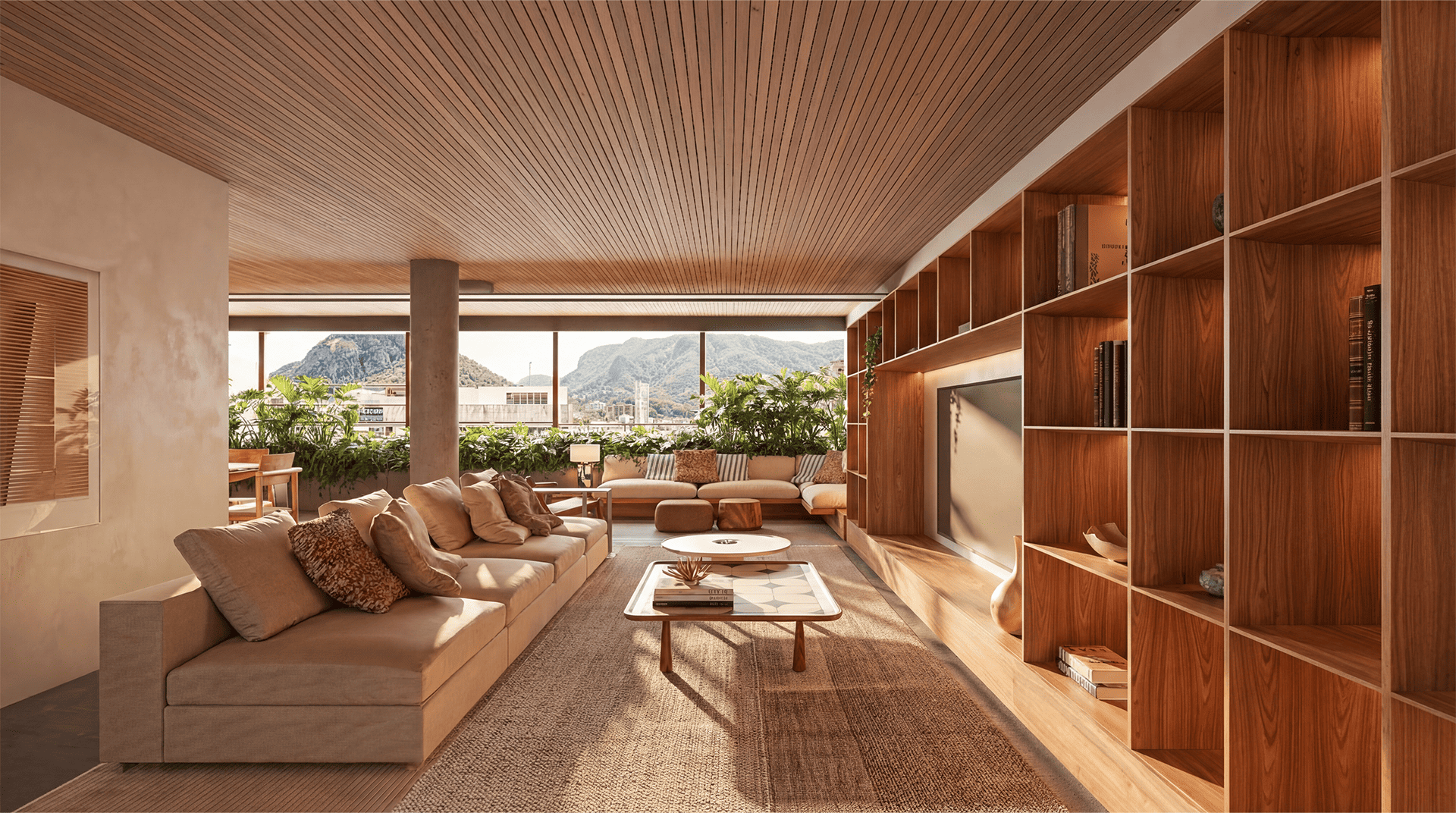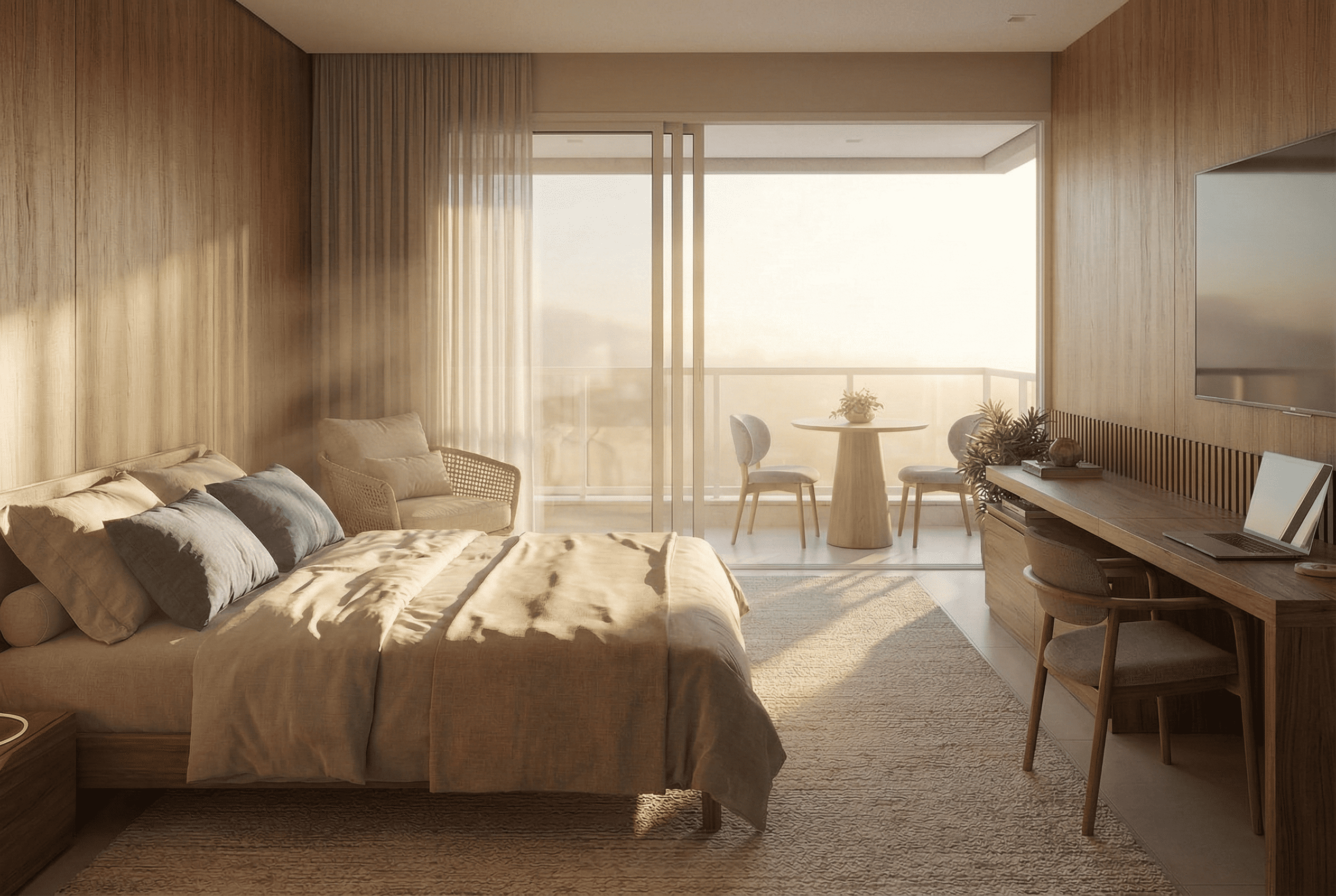 - Acabamentos em porcelanato e madeira