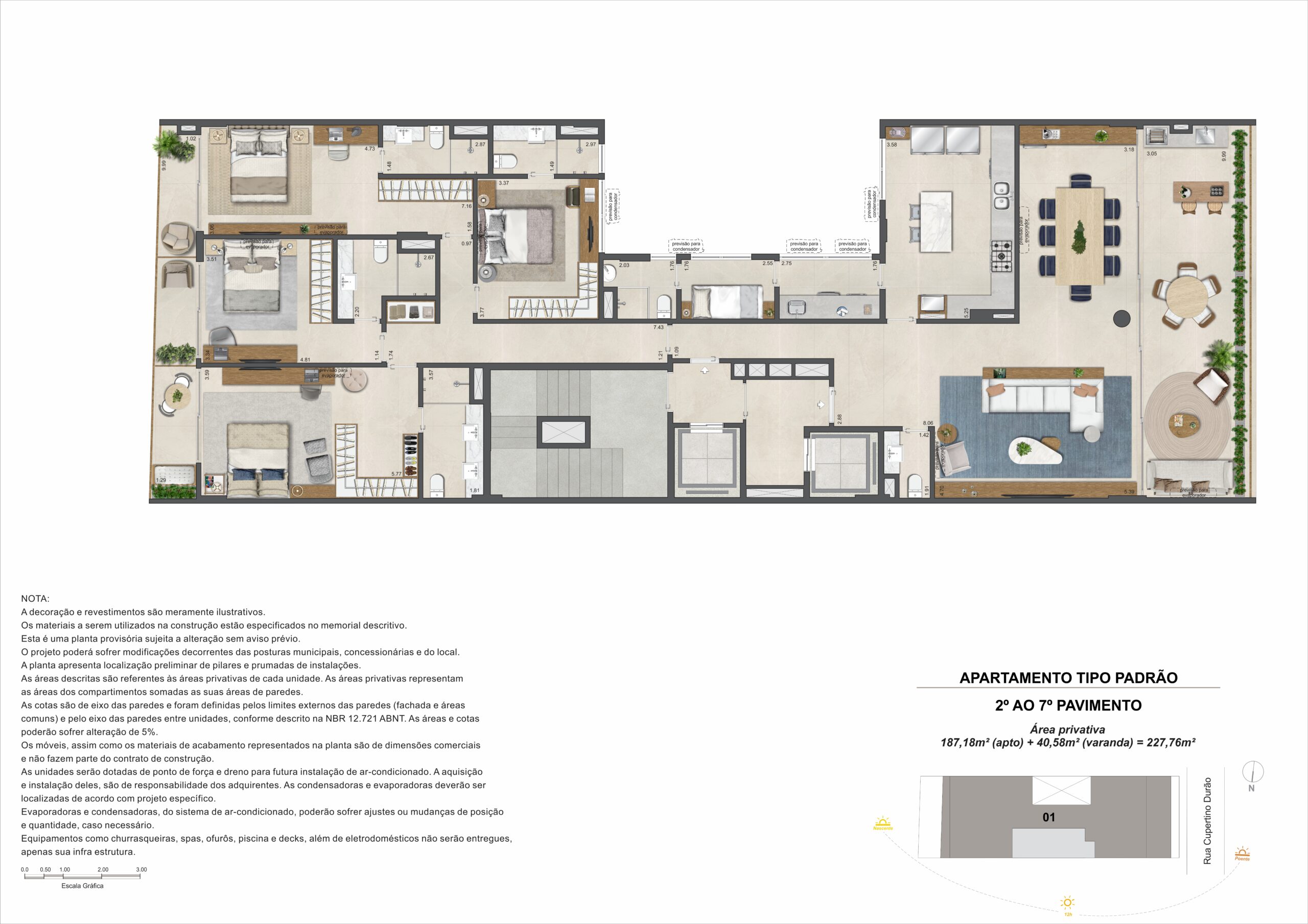 Os apartamentos tipo ocupam andares inteiros, com cerca de 227,76 m² de área privativa. As plantas são lineares, com integração entre sala e varanda, além de quatro suítes e ambientes que favorecem iluminação natural e ventilação.