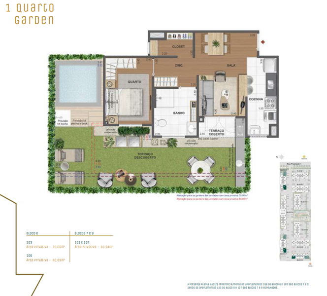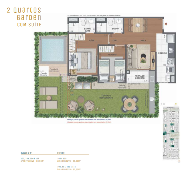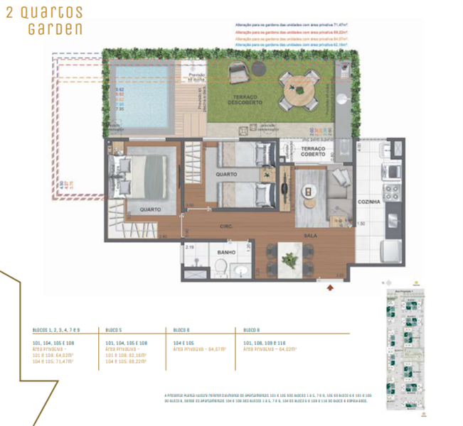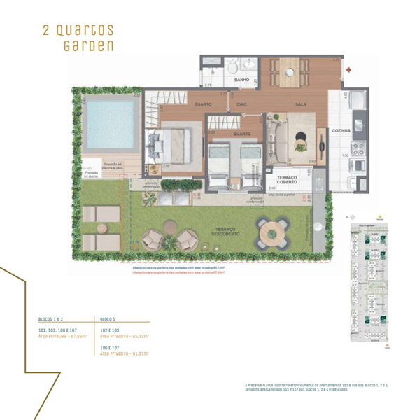 Os apartamentos garden oferecem até 86 m² de área, plantas de 2 quartos (algumas com suíte) e um terraço privativo, ideal para receber amigos e familiares em um ambiente confortável e exclusivo. Com acabamentos sofisticados e excelente ventilação, os gardens são perfeitos para quem deseja mais espaço e contato direto com áreas externas.