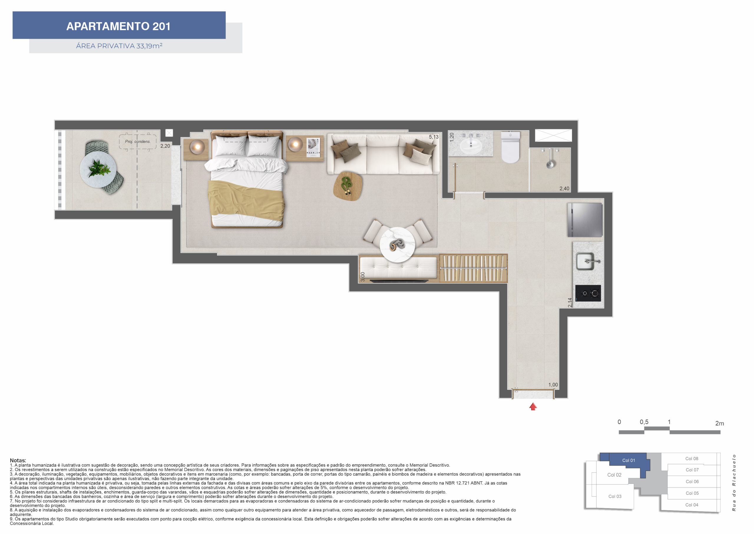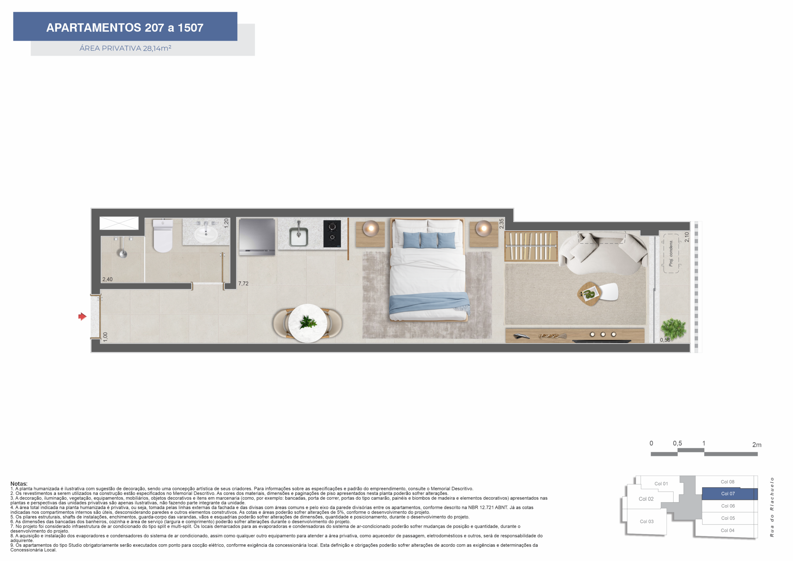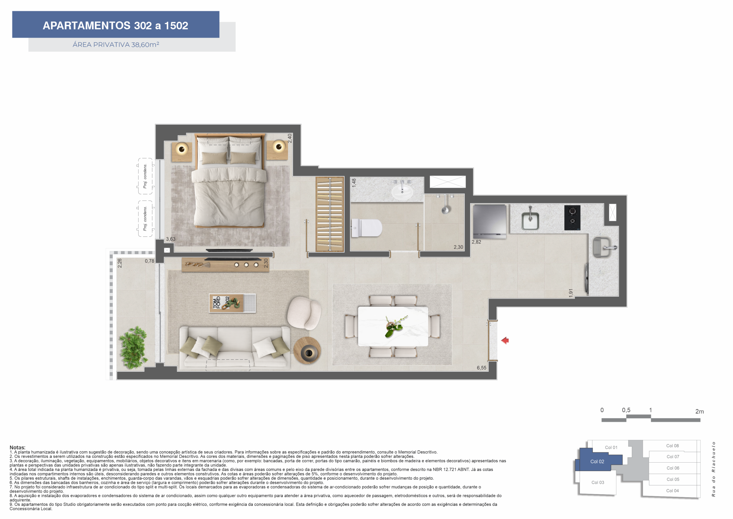 Os apartamentos incluem opções de studios, 1 e 2 quartos, com layouts que priorizam a eficiência dos espaços internos. As plantas foram desenvolvidas para oferecer praticidade e atender tanto à moradia quanto à locação.