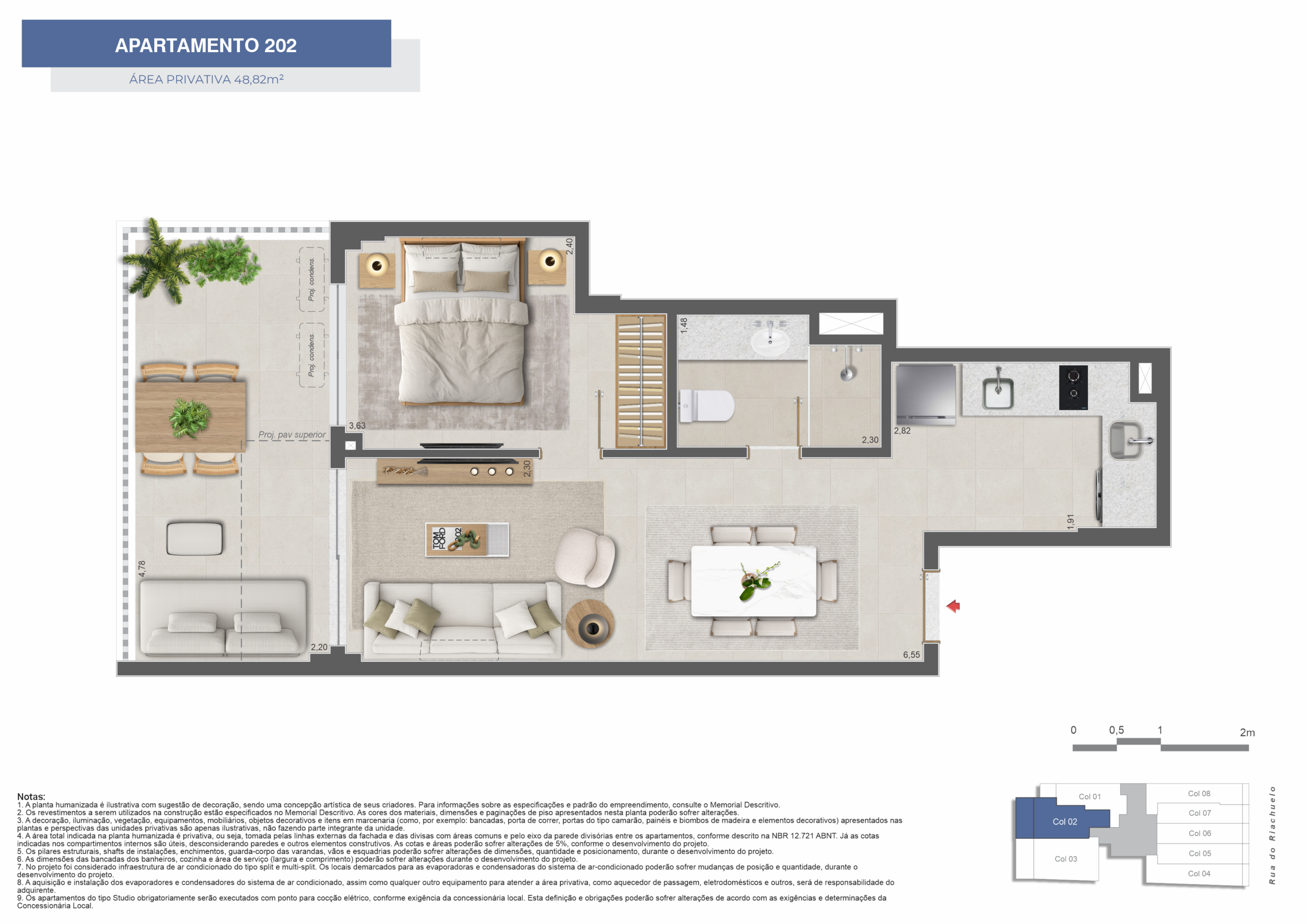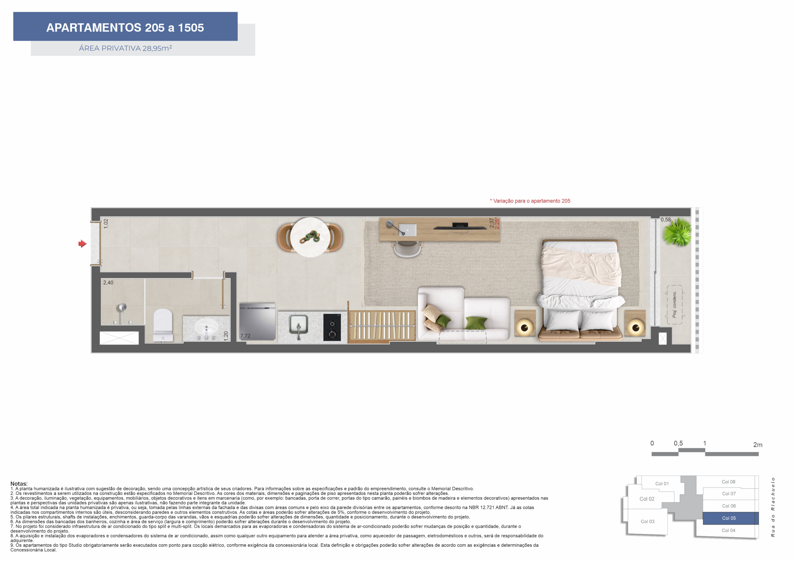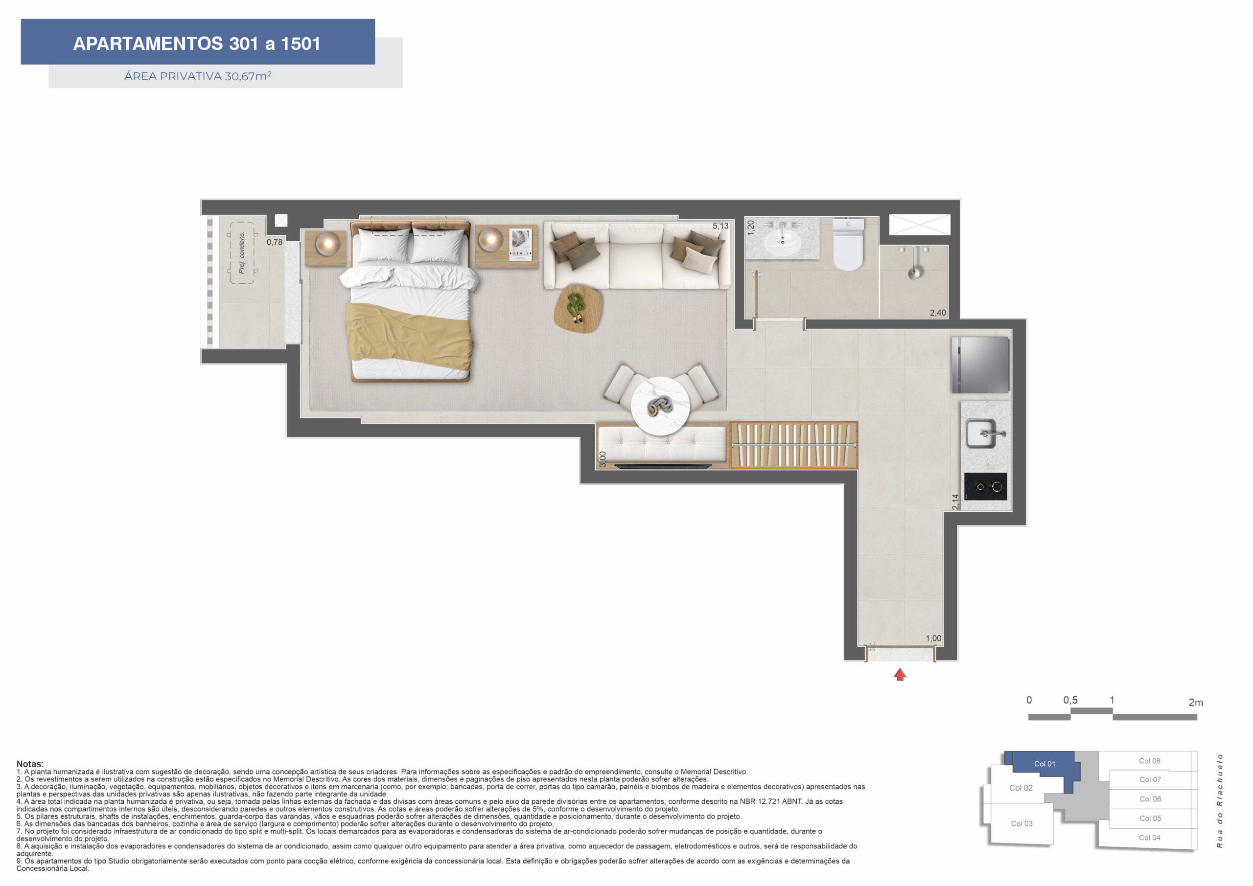 Os apartamentos incluem opções de studios, 1 e 2 quartos, com layouts que priorizam a eficiência dos espaços internos. As plantas foram desenvolvidas para oferecer praticidade e atender tanto à moradia quanto à locação.