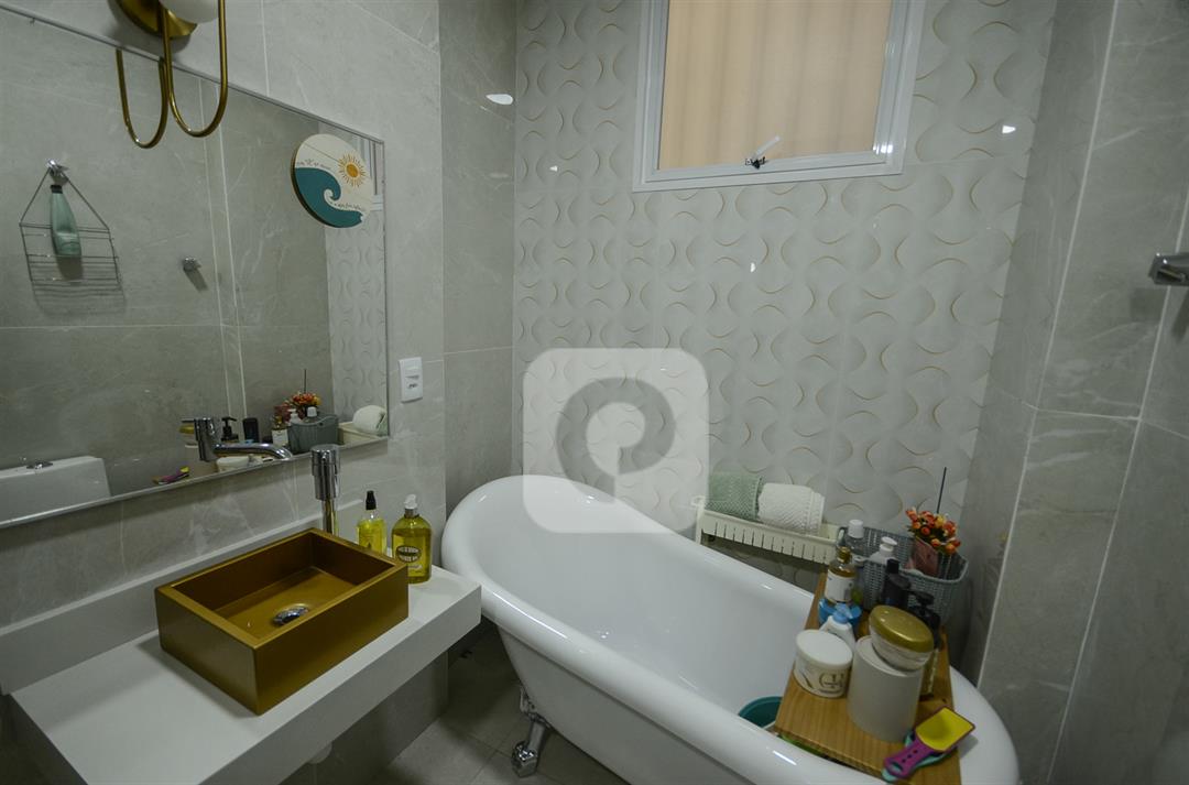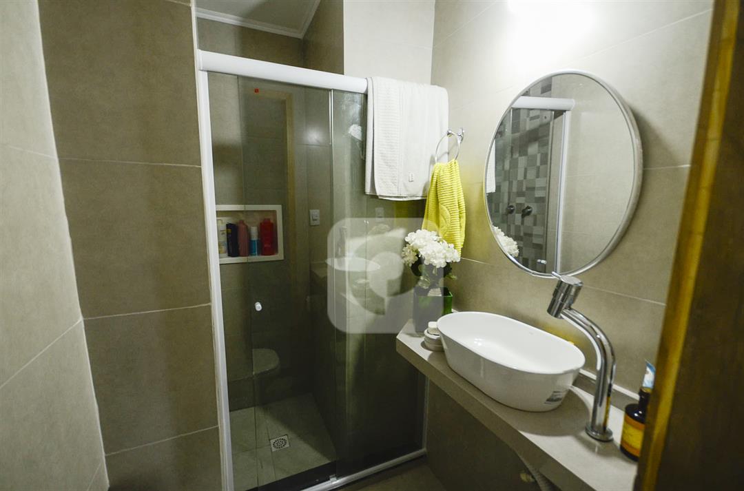 A sala é ampla, com piso laminado de madeira e espaço para dois ambientes. São três quartos confortáveis, sendo um suíte com armários planejados. A dependência completa foi revertida em um banheiro grande e moderno, oferecendo mais conforto ou podendo funcionar como banheiro social principal.