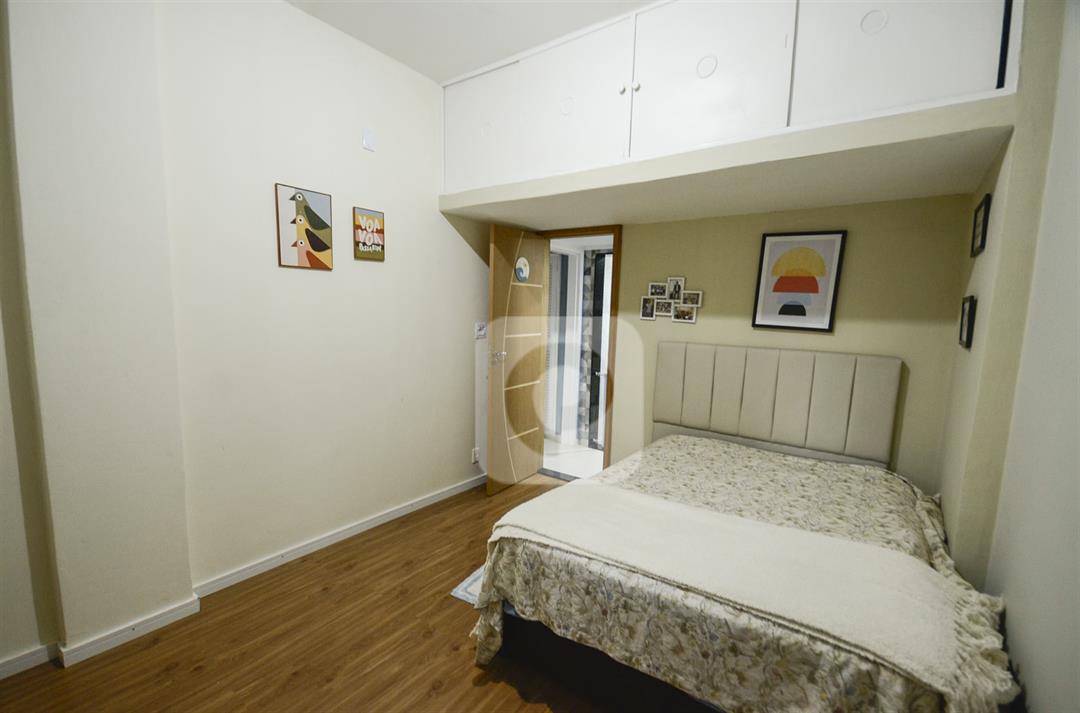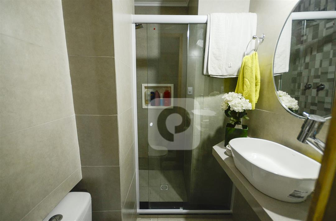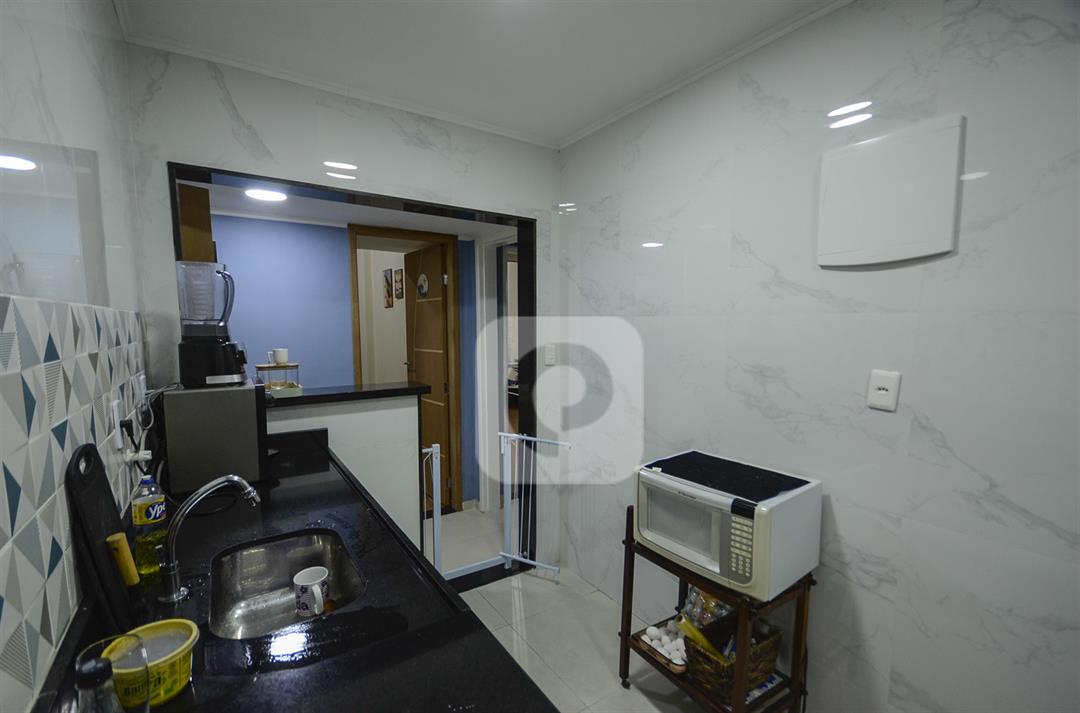 O imóvel fica no primeiro andar de um prédio bem conservado, com elevadores social e de serviço, portaria, interfone, portão eletrônico e área comum. Não possui vaga de garagem nem área de lazer, o que reduz o valor do condomínio.