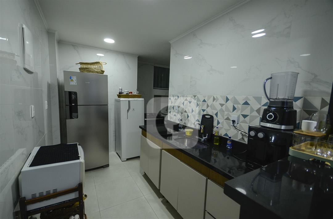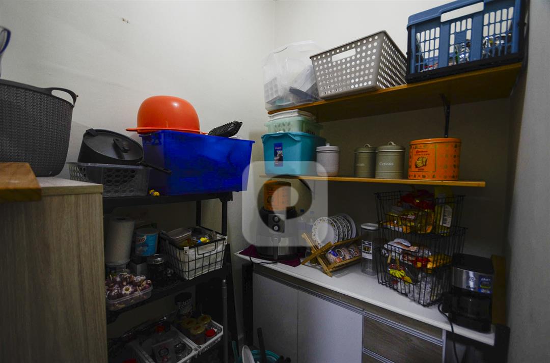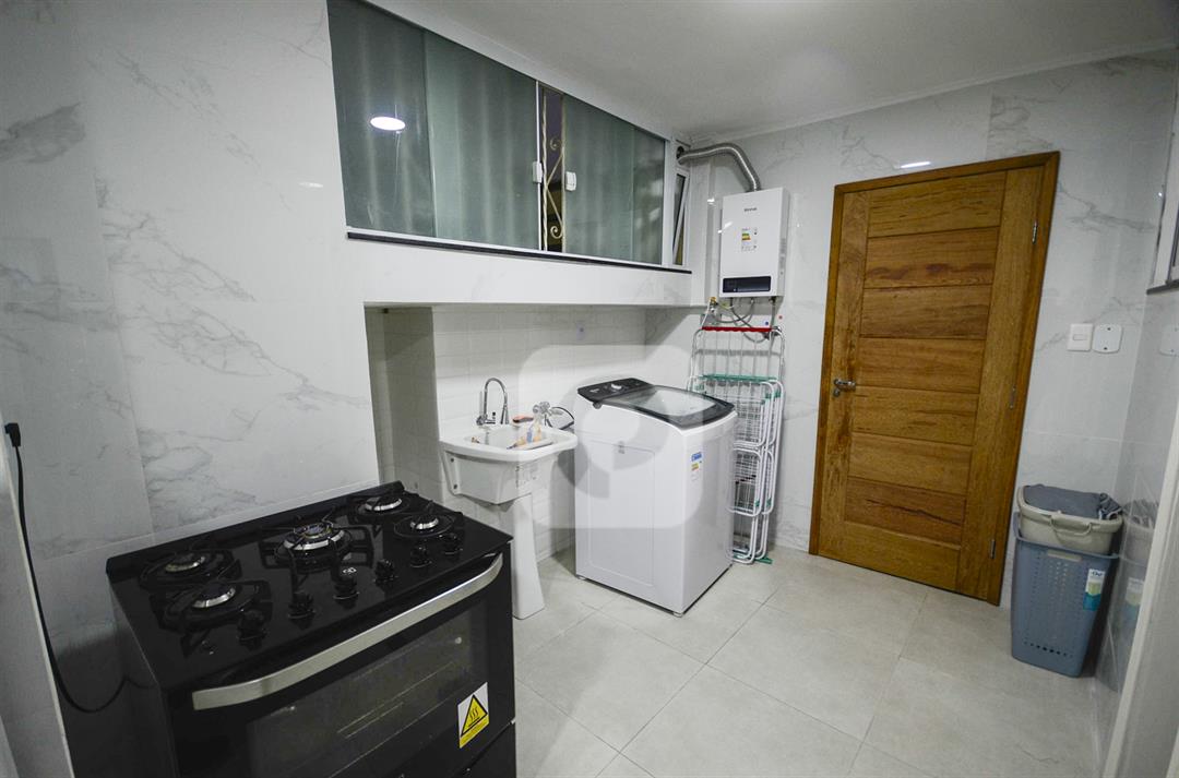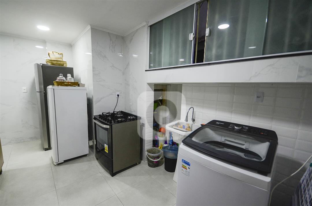 A cozinha é planejada e funcional, com piso em porcelanato, tanque e área de serviço independente. Os quartos possuem armários, e os móveis sob medida otimizam bem os ambientes.