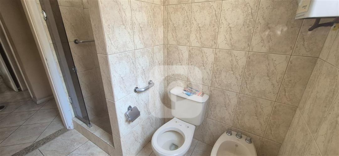 Banheiro social completo, com chuveiro a gás, bidê e dois armários embutidos em alvenaria;