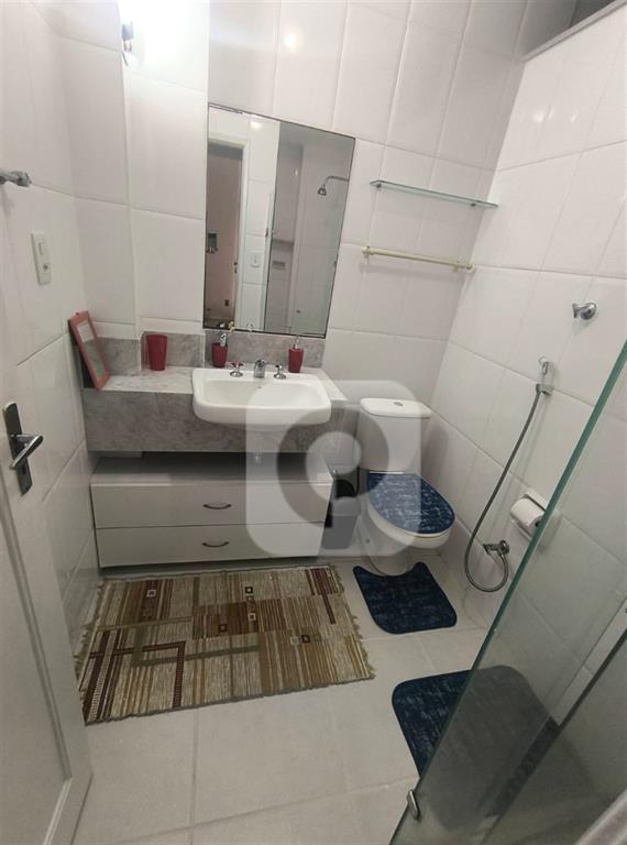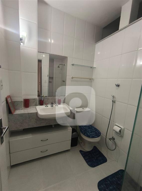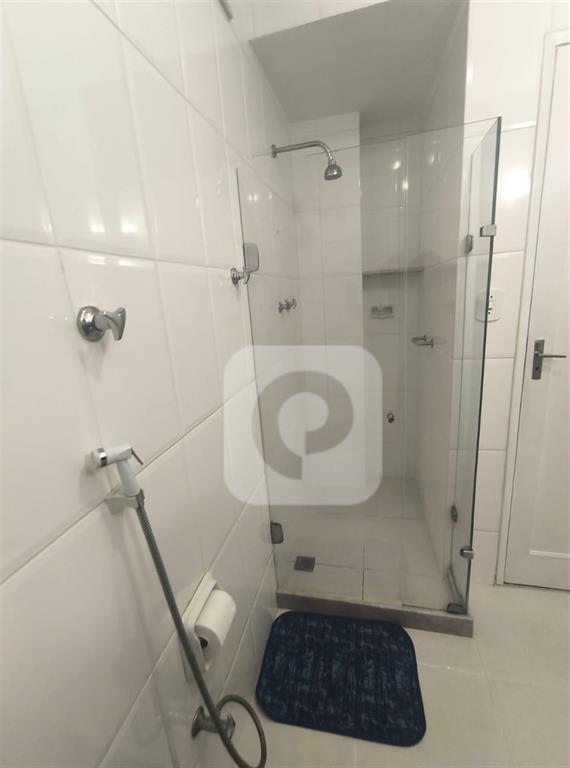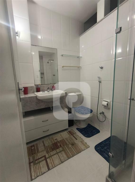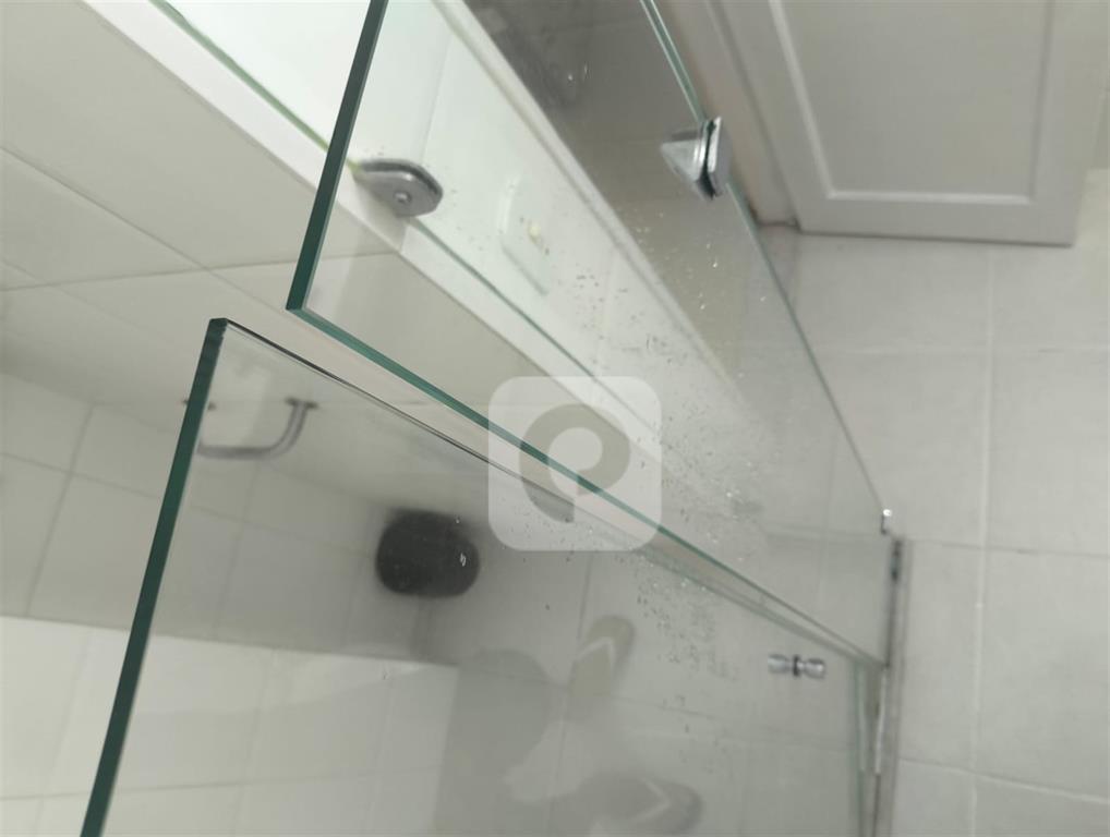 Banheiro social com box em blindex reformado, circulação confortável e chuveiro a gás;
