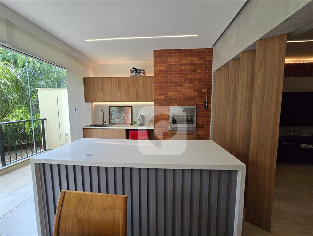 Varanda gourmet com churrasqueira e bancada