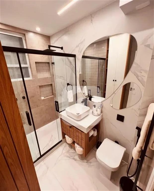 Móveis completos com espelho, ventilador de teto e ar-condicionado com controle remoto, 2 luminárias, no armário há 2 portas com fechadura eletrônica invisível e iluminação decorativa.