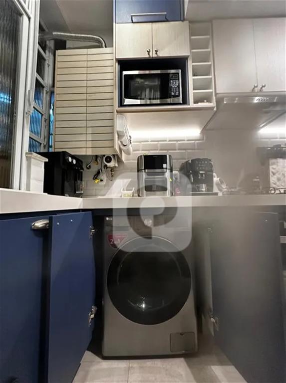 Cozinha integrada à sala e à área de serviço, equipada com tanque, máquina de lavar roupa e máquina de lavar louça embutidas, além de 2 varais suspensos;