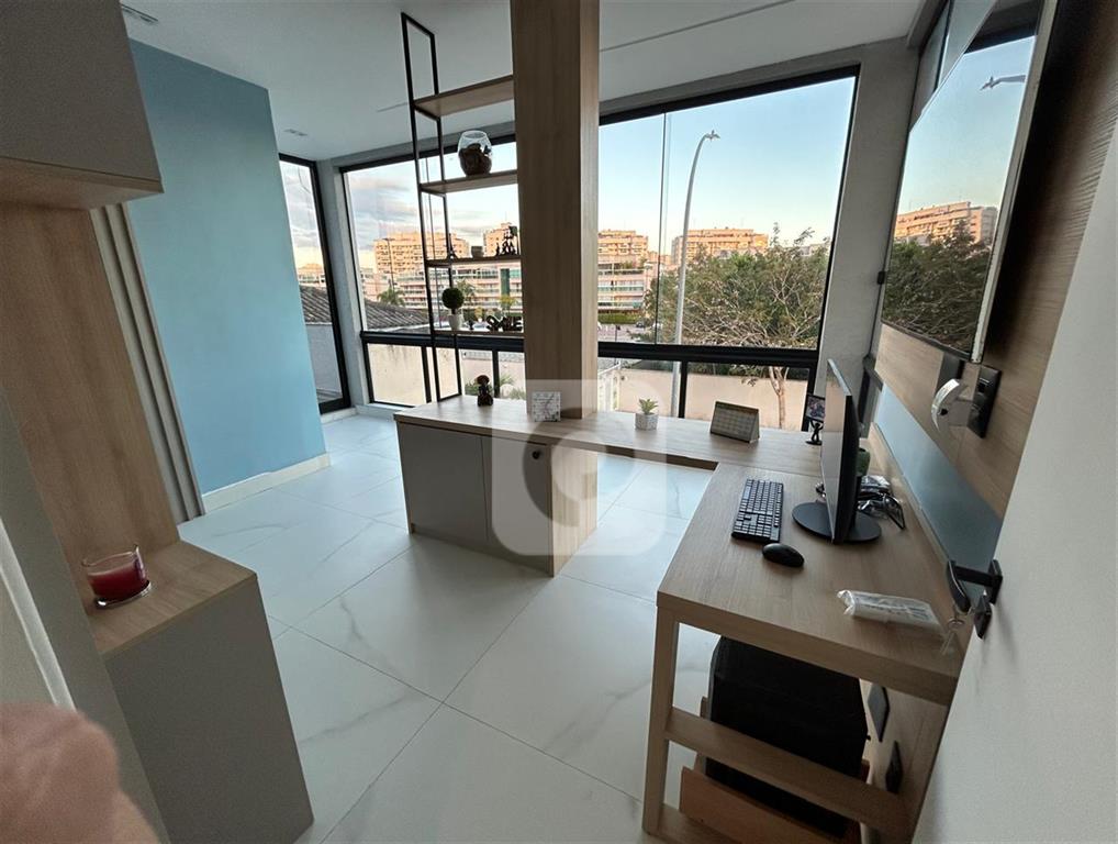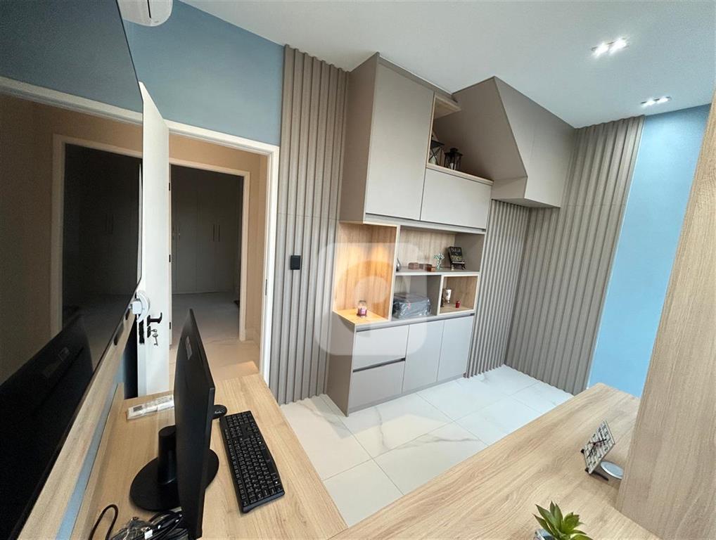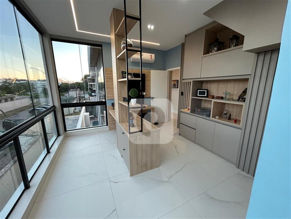 Quartoescritorio – com armarios planejados, fachada em vidro fixo.