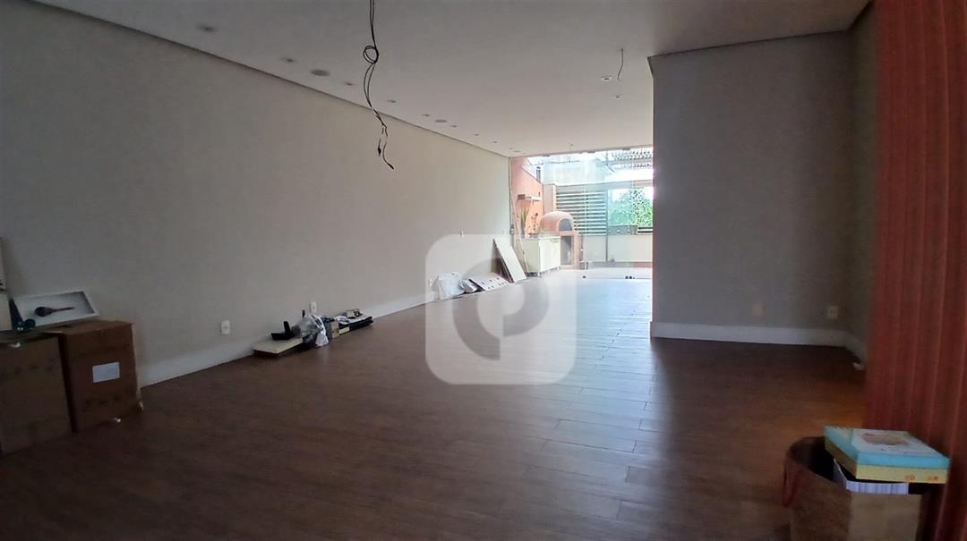 Ampla sala dividida em estar, jantar e TV
