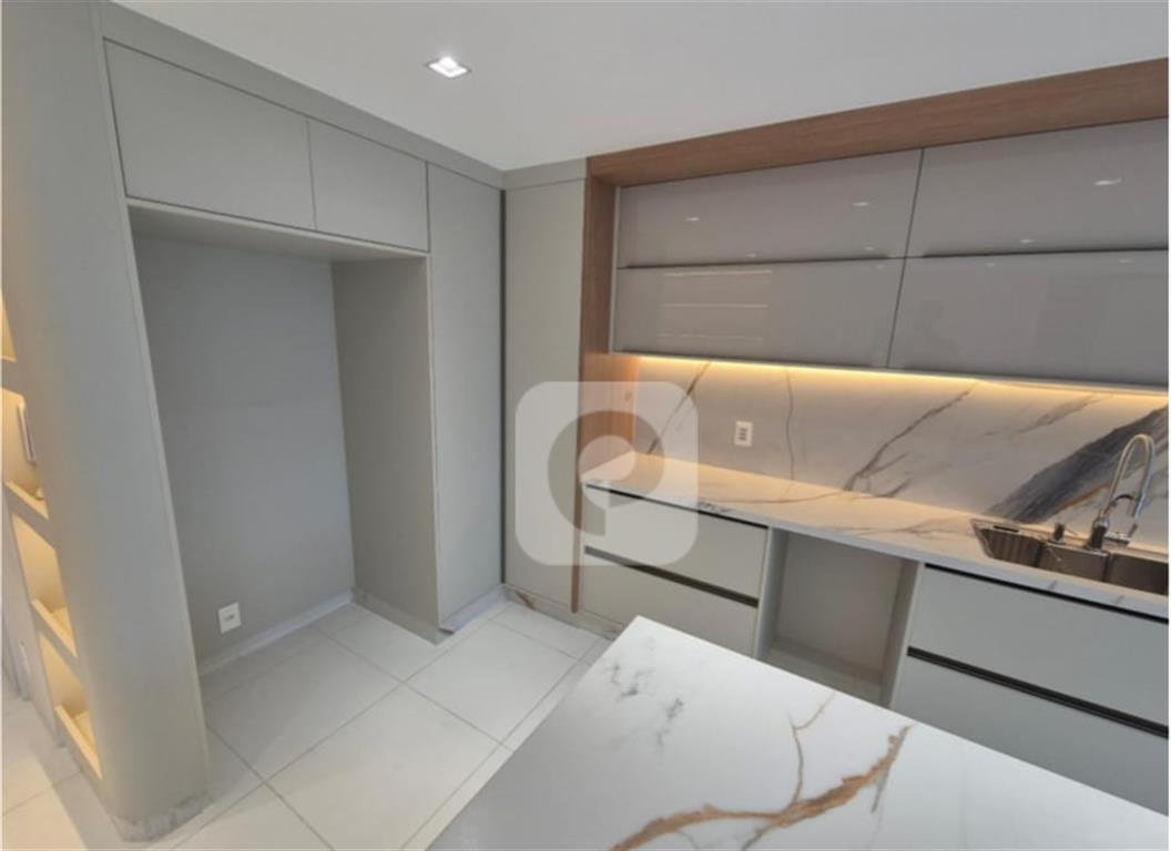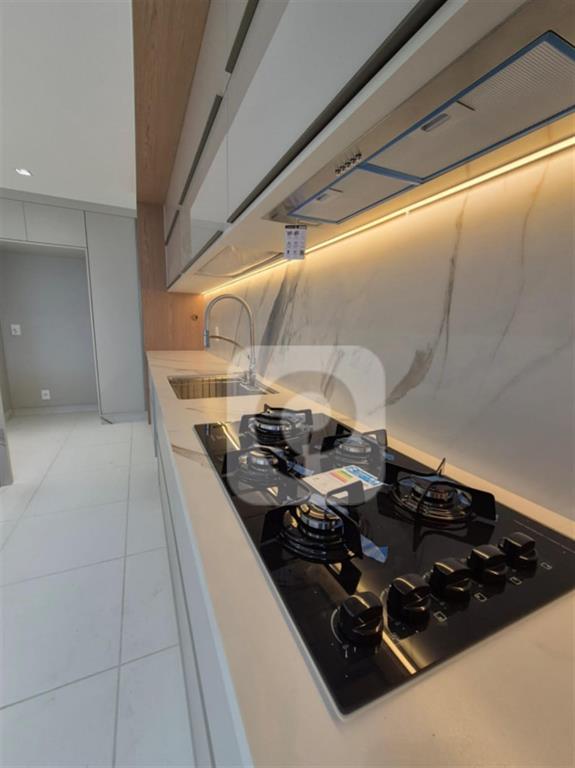 • Cozinha com bancada e revestimentos em pedra Calacata
