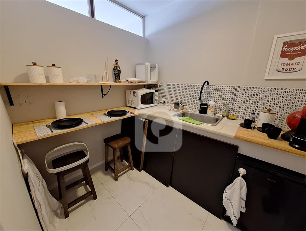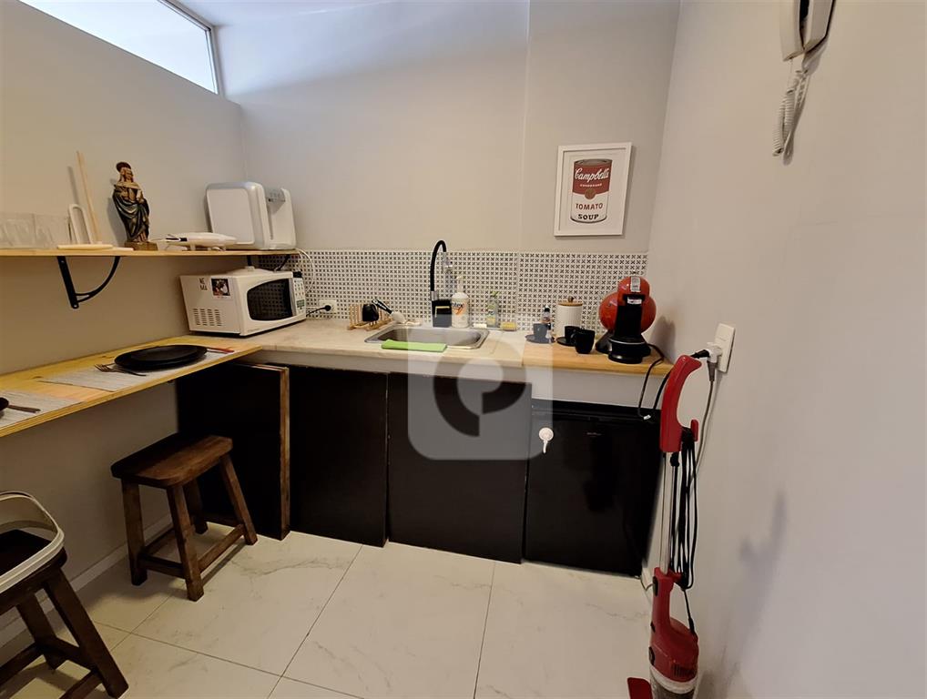 sala de espera, banheiro social e copa/cozinha com frigobar, filtro, microondas e compressor.