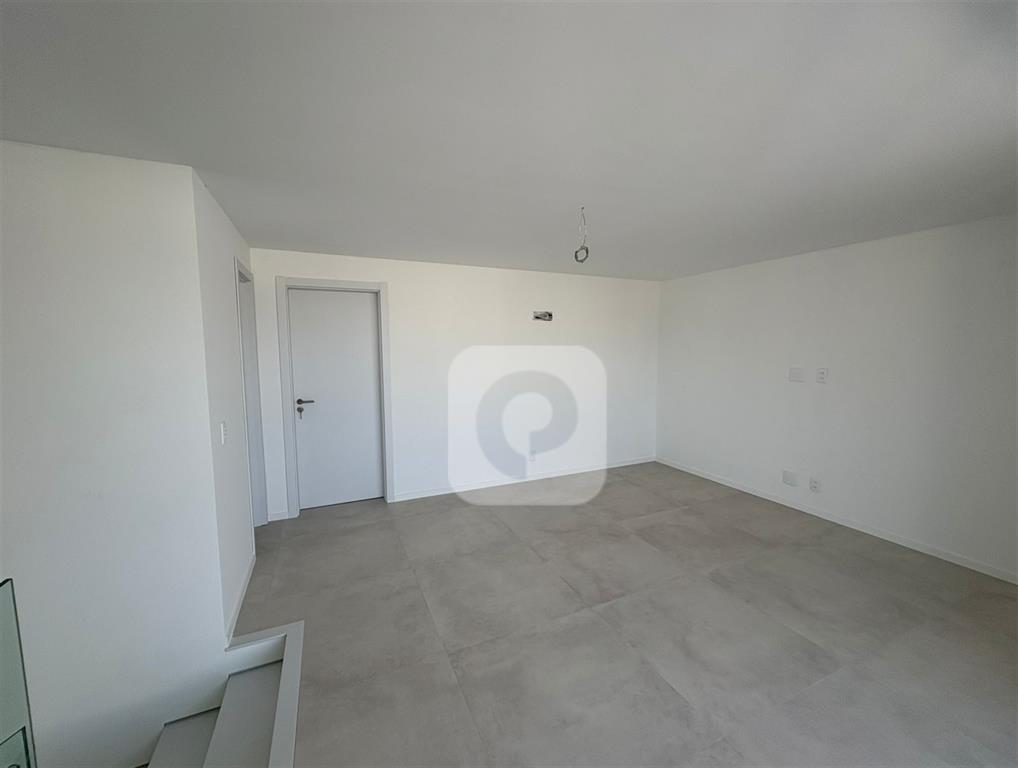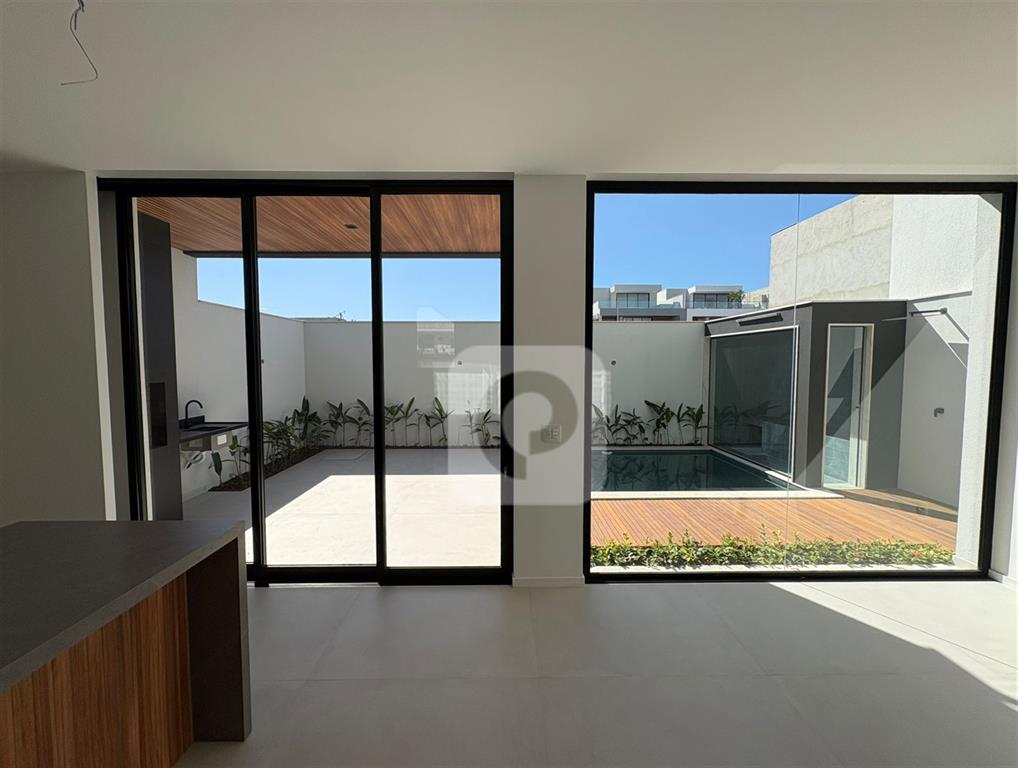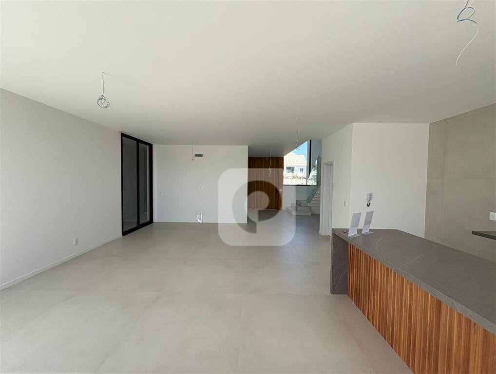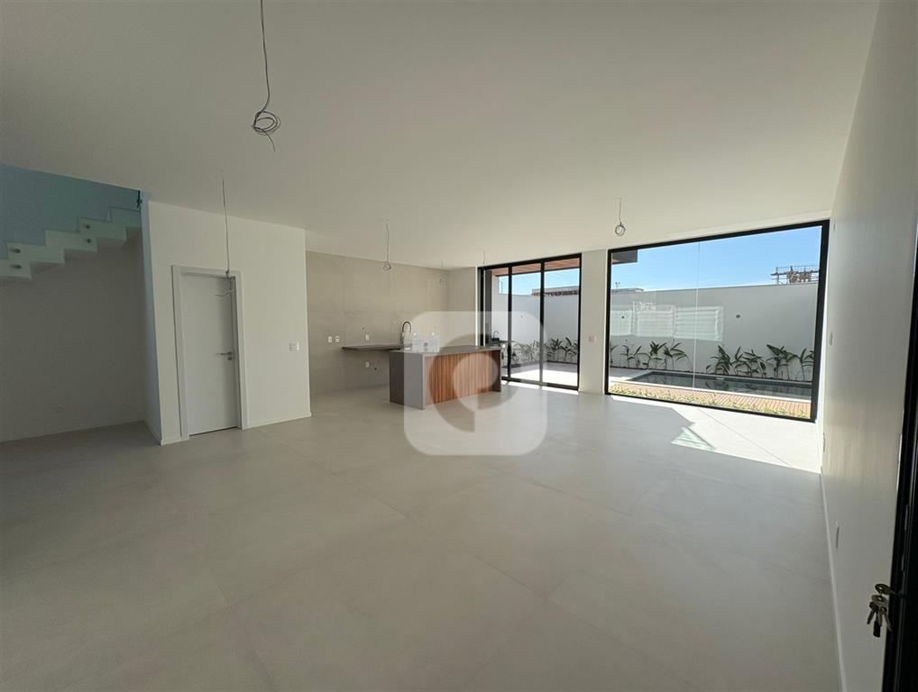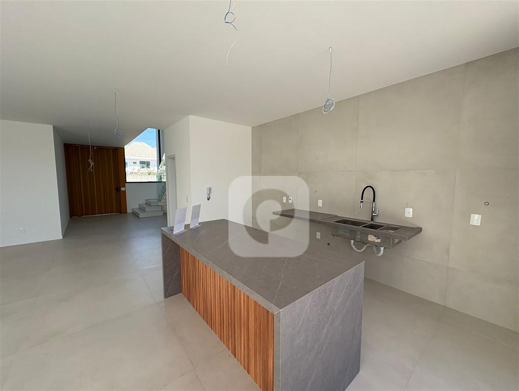 • 1º Pavimento: Composto por uma ampla sala de estar integrada a cozinha com ilha e bancada, área de serviço com lavanderia e a possibilidade de uma suíte térrea, no momento não configurada.