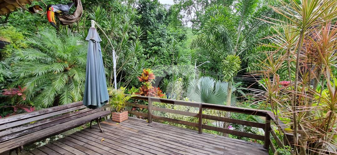 Deck de madeira na frente da casa e um lateral.