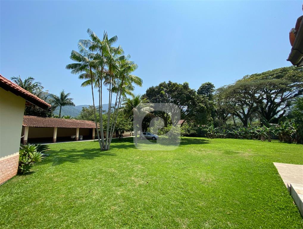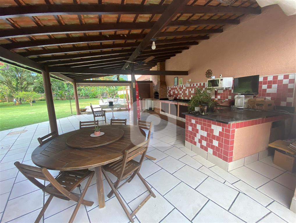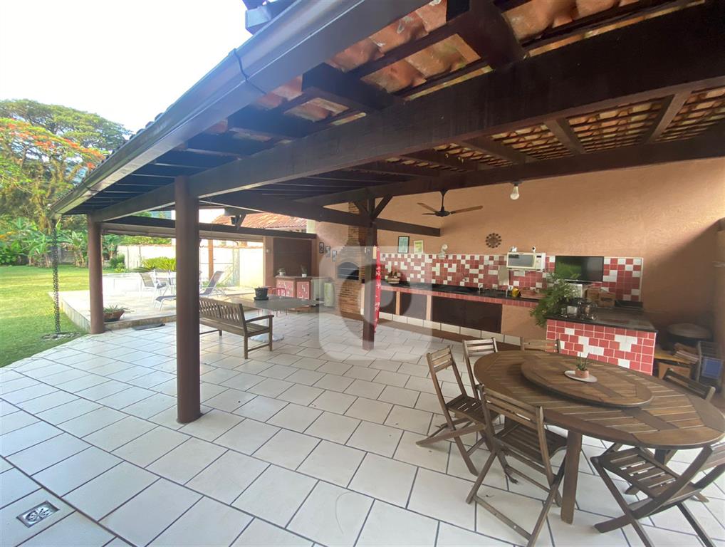 Área externa: terreno com área de lazer com churrasqueira, bancada com fogão, pia e compartimento para gelo. Em anexo, platô com chuveiro e espaço para piscina.